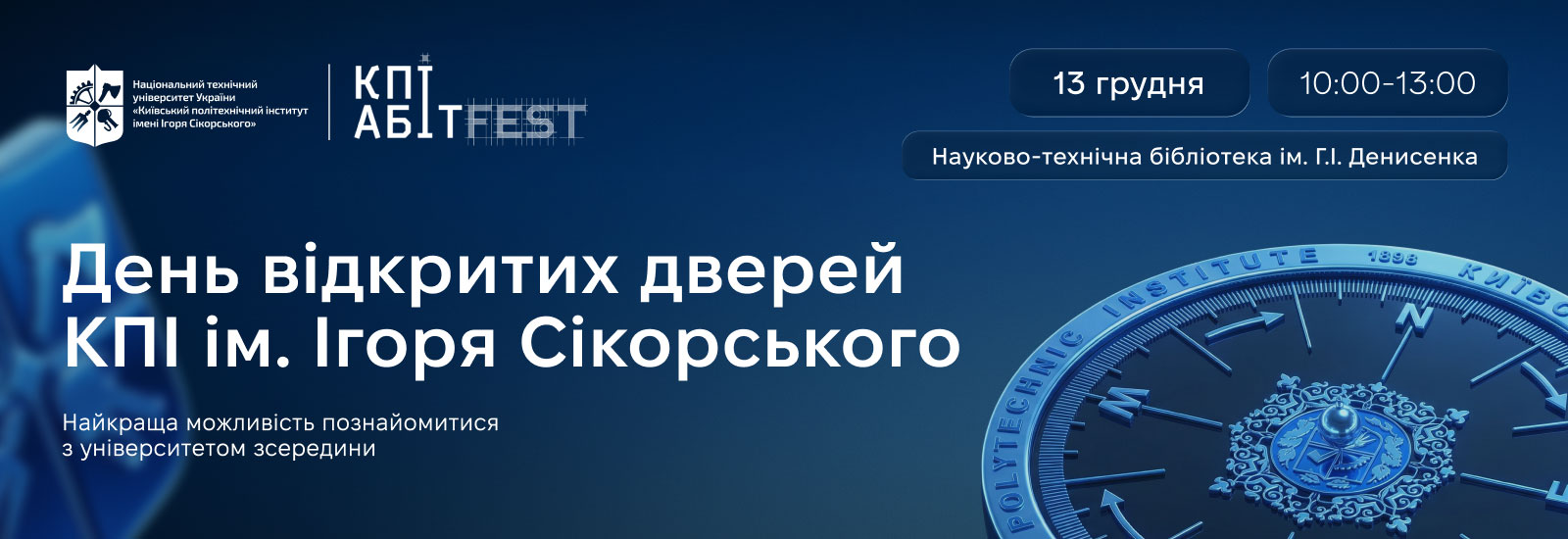 КПІ ім. Ігоря Сікорського запрошує учнів старших класів ваших закладів освіти долучитися до Дня відкритих дверей — KPIAbitFest, який відбудеться 13 грудня з 10:00 до 13:00 у Бібліотеці КПІ ім. Ігоря Сікорського (проспект Берестейський, 37).